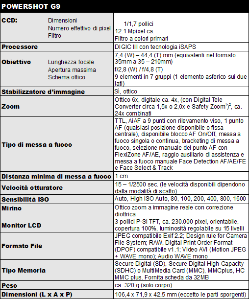 A crescere sono sicuramente i pixel da cui è formata l'immagine; rimane tutta da verificare la qualità dell'immagine risultante, discorso che vale ovviamente in generale e non in riferimento ai modelli che andremo a descrivere. Tornando alla PowerShot G9, torna la possibilità di archiviare fotografie in formato RAW, mente sotto il profilo dell'ottica troviamo la tecnologia IS per la stabilizzazione delle immagini, uno zoom ottico 6x. A livello logico vengono garantite tutte le maggiori funzionalità automatiche e soprattutto manuali tipiche di prodotti di fascia superiore, pur concedendo qualche aiuto all'utente inesperto con tecnologie come la Face Detection, per mettere a fuoco senza errori i volti delle persone ritratte.
