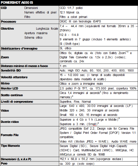 Parlavamo in precedenza di versione semplificata; in effetti il modello PowerShot A650 IS perde la possibilità di archiviare le immagini in formato RAW, così come risultano ridimensionati i tempi di esposizione, ora limitati verso il basso a 1/2000 di secondo contro il valore di 1/2500 di secondo della G9.