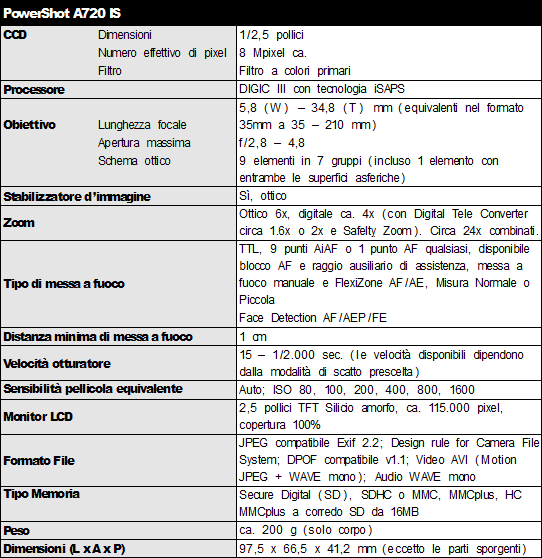 Sensore da 8 Megapixel in abbinamento ad un'ottica corrispondente a 35-210 mm nel formato tradizionale per la muova PowerShot A720 IS, che condivide con tutte le macchine compatte presentate la presenza dello stabilizzatore di immagine.