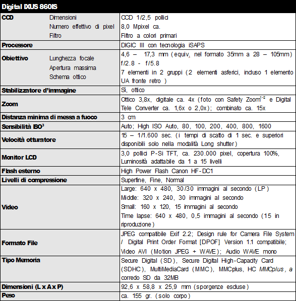 Anche in questo caso ritroviamo il monitor da 3" per 230.000 pixel e lo storage basato su schede memoria Secure Digital. Drasticamente ridotti peso e dimensioni rispetto al mondo PowerShot, come tipico dei modelli marchiati IXUS della Casa giapponese.