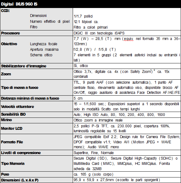 Ultima delle sei fotocamere compatte prese in esame è la IXUS 960IS, che si distingue dal modello precedentemente descritto per diverse caratteristiche. In primis troviamo il sensore da 12,1 Megapixel installato sulla Canon PowerShot G9 e sulla A650 IS, mentre sul fronte dell'ottica si torna alla normalità con un 36-133mm equivalente, perdendo di fatto l'interessante funzionalità grandangolare.