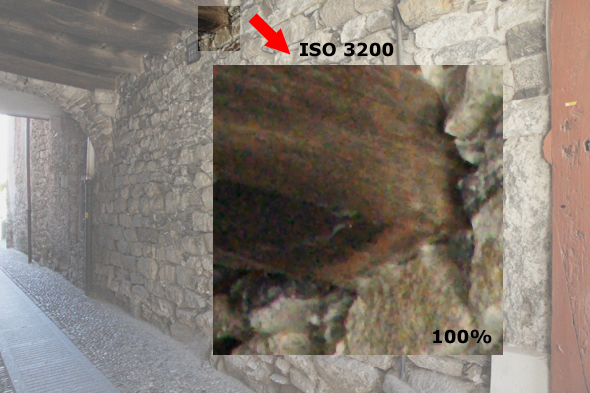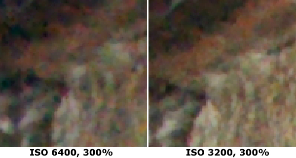 Come reso evidente dai particolari qui sopra, riportati al 300%, l'estensione della gamma ISO oltre il valore di 3200 ISO porta ad un aumento del rumore, visibile sotto forma di falsi colori e soprattutto di un calo evidente della nitidezza e del dettaglio. Confermiamo in ogni caso la bontà della resa generale, anche in virtù di valori di ISO così elevati.