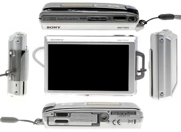 La Sony DSC-T200 punta innanzitutto ad essere semplice: pochi tasti fisici e accensione all'apertura del coperchio copri-lenti. Nella parte superiore del corpo, costruito interamente in metallo, troviamo un tasto a scorrimento bidirezionale che regola lo zoom, il pulsante di scatto, il pulsante che avvia la fase di riproduzione delle foto e il tasto power, da utilizzare in alternativa all'abbassamento della cover frontale.
