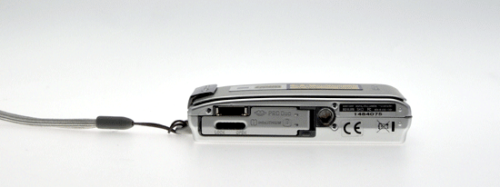 La parte inferiore ospita la filettatura (in metallo) per il montaggio sul cavalletto, il connettore per il collegamento a pc e televisori (uscita USB o RCA audio/video) e lo sportello che da accesso al vano che contiene la batteria e lo slot Memory Stick.