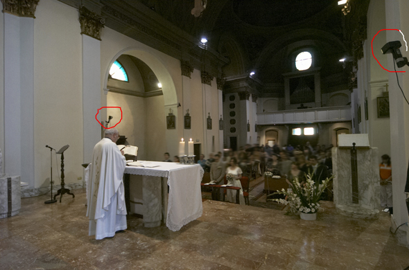 Un accortezza da consigliare è quella di lavorare sempre con il flash a slitta attivo: questa non è una regola ferrea ma vi permetterà di fotografare con sensibilità non superiori agli 800 ISO, potrete essere sicuri di ottenere un esposizione uniforme del primo piano, aspetto fondamentale poiché la maggior parte delle riprese saranno dei ritratti o delle scene di gruppo e non potete permettervi di perdere uno scatto perché affetto da micromosso o perché la grana dei mezzitoni è talmente elevata da perdere definizione. La soluzione ideale è quella di ricreare una illuminazione uniforme in tutto l’ambiente, questo potete farlo aggiungendo dei punti luce ai lati dell’altare rivolti verso l’assemblea, oppure ai lati della navata al centro della chiesa.