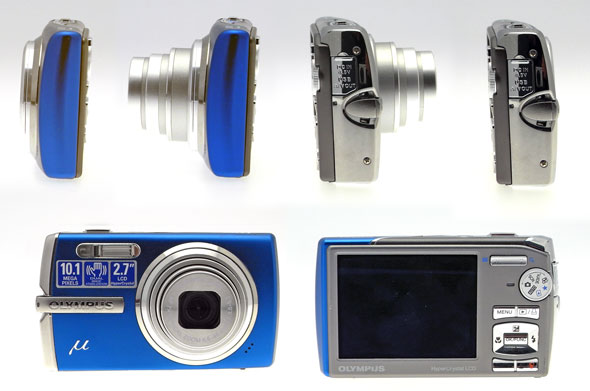 La Olympus µ 1010 è, tra le tre fotocamere, quella dall'ingombro sulla carta maggiore; il suo design, molto meno squadrato delle concorrenti, la rende però molto tascabile. Il pulsante di accensione è posto in alto, a sinistra del pulsante di scatto, ed è contornato da una corona circolare in grado di illuminarsi di blu per segnalare lo stato della fotocamera. Lo zoom è comandato da un selettore a due vie posto nella parte posteriore della fotocamera , a portata di pollice. Più sotto trova spazio la rotella di selezione dei modi, mentre ancora più in basso troviamo un joypad a cinque vie attorniato da ulteriori 4 tasti; oltre a permetter di navigare nei menu e nelle foto, ad ogni tasto direzionale è associata un scorciatoia relativa a uno dei parametri di scatto. Il tutto è raggruppato a destra del display da 2,7".