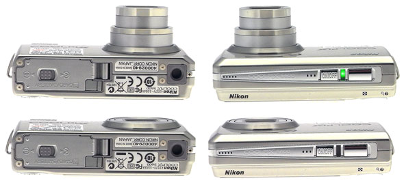 La Nikon S600 ha un design più squadrato, ma la disposizione dei comandi è simile al modello precedente. Su lato superiore i tasti di accensione e scatto sono separati da un led che segnala l'attività della fotocamera e sul lato destro sono ubicati l'asola per il laccetto e il connettore microUSB audio/video e connessione al PC. Anche in questo caso il controllo dello zoom è affidato a un selettore a due vie, mentre il resto dei comandi è attuato tramite quattro tasti funzione e un joypad a cinque vie. Quest'ultimo è formato in realtà da una rotella, cliccabile nelle 4 direzioni e al centro, che offre una modalità più rapida per lo scorrimento dei menu. Anche in questo caso filettatura e vano per batteria e scheda di memoria sono ubicati sul lato inferiore, posti alle due estremità. Entrambi i pezzi utilizzano plastiche nella loro costruzione. La parte frontale ospita l'obiettivo, il flash integrato e l'illuminatore AF. I fori sotto i quali sono posti altoparlanti e microfono si trovano in questo caso sul lato superiore.