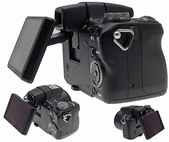 Nella zona che digrada verso il posteriore troviamo il tasto che commuta la visualizzazione tra mirino e display e due tasti per la riproduzione delle foto: quello più a sinistra attiva la visualizzazione delle foto in forma di presentazione con effetti grafici e musicali. Il retro ospita l'ampio display da 3" inclinabile verso l'alto e il basso e, appena dietro la ghiera dei modi, il commutatore che comanda lo zoom. Più in basso i tasti home e menu offrono accesso alle impostazioni, mentre il joypad a 4 vie con tasto centrale cliccabile e ghiera esterna rotante permette la regolazione dei parametri di scatto, l'accesso alle scorciatoie e la navigazione all'interno delle foto.