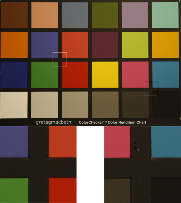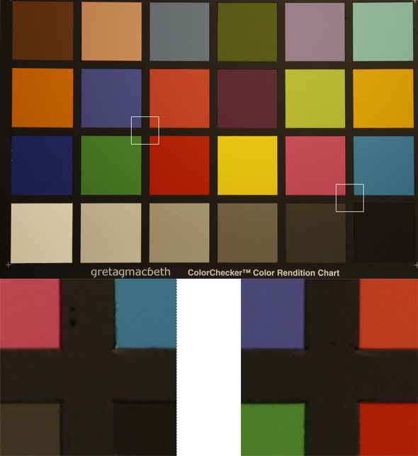 L’analisi alle Gretag Macbeth rivela un ottimo contenimento del rumore: questo diventa percepibile ad 800 ISO senza risultare fastidioso ed a 1600 ISO la grana è molto compatta. Prestazioni del genere su di una fotocamera di questa fascia, lasciano soddisfatti dei soldi spesi per l'acquisto. Di seguito sono visibili le riprese delle Gretag, i riquadri bianchi sono stati riportati sotto la mira ingranditi al 200%