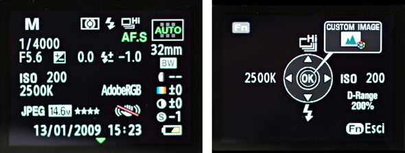 In qualsiasi momento è possibile richiamare le impostazioni in uso tramite il tasto INFO mentre attraverso il pulsante Fn si accede alla modifica dei parametri di maggiore utilizzo quali sensibilità ISO, modalità di scatto, bilanciamento del bianco, preset ed impostazioni flash.