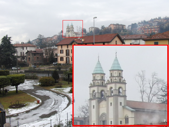 Dallo stesso punto di ripresa e mantenendo le stesse impostazioni si è scattata una ulteriore immagine del campanile alla focale tele di 432 mm.