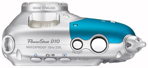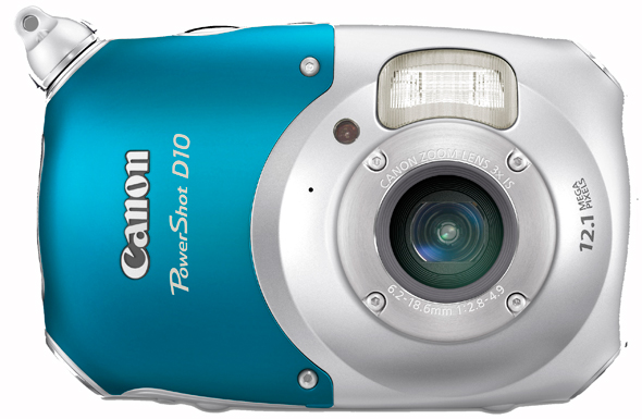 La vera novità della serie Power Shot è lei la D10, una fotocamera compatta scafandrata, resistente agli urti ed immergibile fino a -10 m. Non solo una fotocamera subacquea però: la D10 è resistente agli urti per cadute da 1,22 m di altezza e ne viene garantito il funzionamento fino a -10°C. Integra all'interno del corpo bombato un sensore da 12,1 Mp ed offre uno zoom ottico da 3x.
