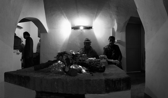 Una ulteriore applicazione è quella di posizionare il soggetto all'interno di un contesto che non è possibile riprendere con la focale disponibile: nella foto sopra sarebbe stato impossibile abbracciare l'intero braciere e nel contempo includere i cacciatori sullo sfondo a destra con l'obiettivo da 17 mm su formato APS-C; cinque scatti verticali hanno permesso di allargare il campo di vista ed ottenere un diverso tipo di prospettiva.