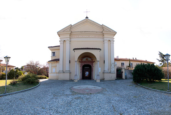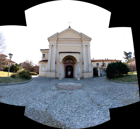 La stessa chiesa precedentemente ripresa con il fisheye, viene ora fotografata con uno zoom standard tramite una matrice di 5 scatti: 3 scatti orizzontali a comporre la facciata della chiesa ed il piazzale dall'alto in basso e 2 scatti verticali, uno per lato ad includere il prato ed i lampioni. Il software che ha generato l'immagine composita ha distorto le singole immagini per poterle unire tra loro in maniera uniforme ed ha lasciato delle zone vuote (nere), in corrispondenza delle informazioni mancanti.