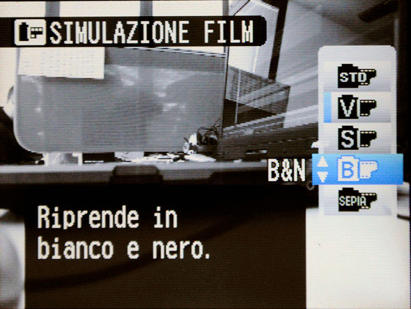 Sempre nello stesso menu si imposta la dimensione ed il formato immagine, il bilanciamento del bianco e la simulazione del tipo di film. Quest'ultima funzione raccoglie alcuni preset atti a simulare il comportamento delle pellicole Velvia, Provia, Astia, B&W ed un impostazione Seppia.