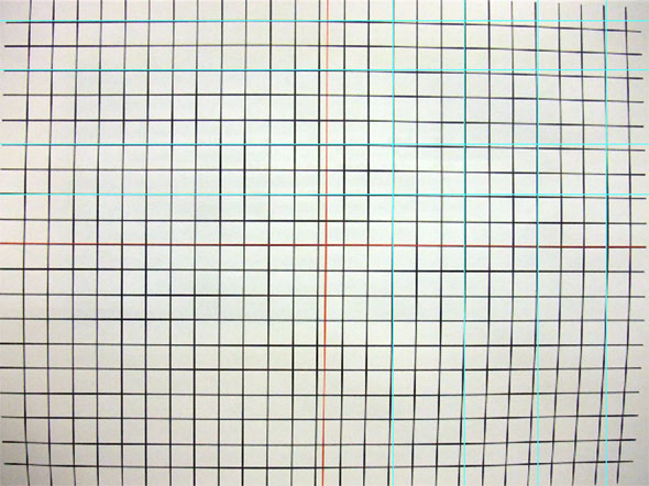Abbiamo valutato sempre tramite mire ottiche la distorsione a barile e cuscino indotta dall'ottica rispettivamente alla focale wide ed alla focale tele. In particolare il barile è pronunciato alla focale minima di 28 mm equivalenti. Come visibile in figura, le linee nere hanno una deformazione pronunciata man mano che ci si allontana dal centro dell'immagine. L'incrocio delle linee rosse rappresenta il punto centrale, le linee azzurre invece l'andamento ideale in mancanza di distorsione.