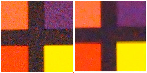 Ripresa in bassa luce: a sinistra l'algoritmo di riduzione del rumore ad alti ISO disattivato, a destra attivato in modalità High