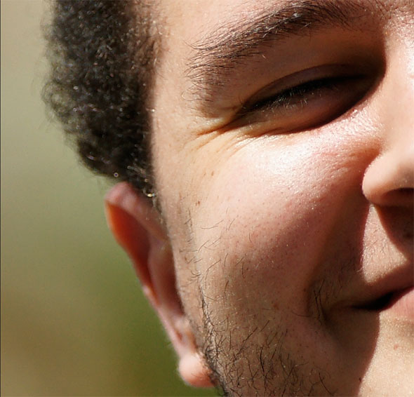 Come è possibile osservare nei due ingrandimenti al 100%, lo sfuocato è molto graduale: nell'ingrandimento al centro è possibile osservare la ridottissima profondità di campo che fa sfumare l'orecchio e i capelli; nell'ingrandimento al bordo, la rete alle spalle del soggetto non è più visibile ma si tramuta in una morbida pasta che raccoglie i cromatismi di fondo.