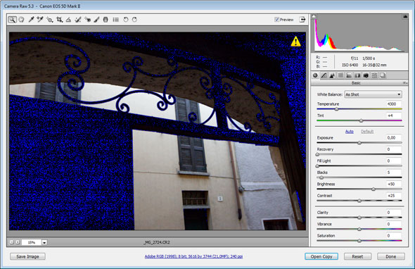 La differenza di elaborazione tra l'algoritmo di demosaicing adottato dalla fotocamera e quello proposto dal software di riferimento ACR 5.3 mette in risalto come sia possibile effettuare un buon recupero delle ombre e delle alte luci appoggiandosi al software esterno; anche lavorando in alta sensibilità. Canon Eos 5D Mark II infatti restituisce un ottimo file jpeg, il cui carico informativo viene però limitato, è bene quindi scattare in modalità raw per recuperare il maggior numero di dettagli possibili.