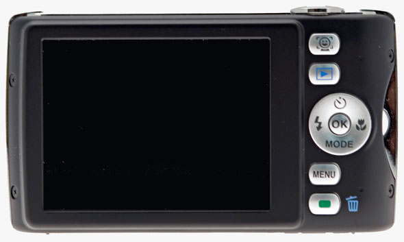 Le dimensioni contenute di 97x54x21.5 mm lasciano spazio ad un display LCD TFT da 2,7" e 230.000 punti posto sul dorso della fotocamera. A lato di questo trovano posto i pulsanti di comando che dall'alto in basso vedono l'attivazione dell'algoritmo face detection/smile capture, il pulsante di riproduzione, il dial di selezione delle modalità flash, autoscatto, messa a fuoco e preset di ripresa. Il tasto centrale del dial permette di confermare la selezione; sotto il dial il pulsante di accesso al menu e il "TASTO VERDE" personalizzabile completano il quadro dei comandi raggiungibili comodamente con il dito pollice mentre si impugna la fotocamera.