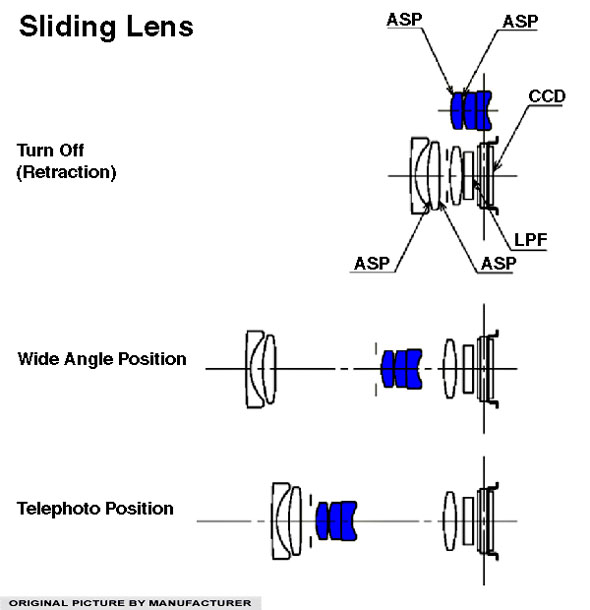 Il sistema prende il nome di sliding lens e non è nuovo nel campo delle fotocamere compatte: il gruppo ottico centrale viene spostato lateralmente, al di fuori dell'asse ottico in maniera da poter accorciare maggiormente lo zoom quando viene retratto. Tre elementi asferici e uno a bassa dispersione completano uno schema composto da 7 elementi in 6 gruppi.