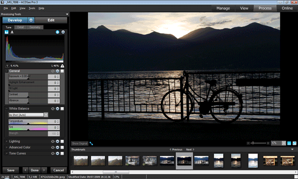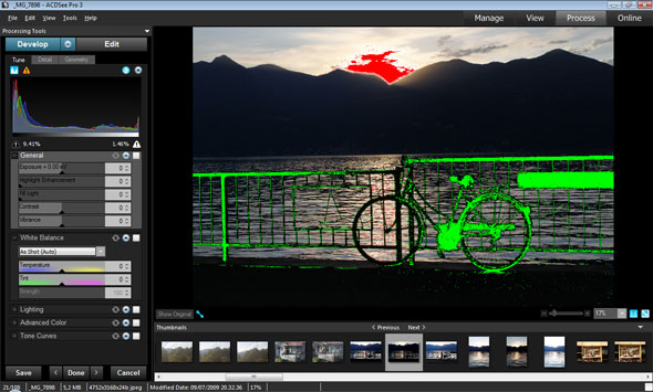 Assieme alla sezione Manage, la sezione Process è quella che offre il maggior numero di strumenti e di opzioni, studiate per affrontare la modifica ed il ritocco delle immagini. La schermata Process è divisa in tre zone principali: la spalla sinistra riporta gli strumenti di correzione e fotoritocco, il riquadro centrale lascia spazio all'immagine in lavorazione sulla quale sono visibili in tempo reale le modifiche effettuate, la parte bassa raccoglie la sequenza di immagini selezionate in precedenza.