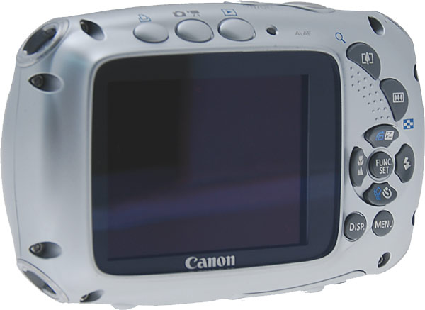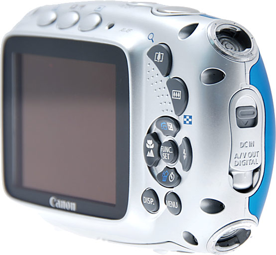 Si possono notare ad esempio i pulsanti per passare alla modalità macro, impostazione del flash, dell'autoscatto, oltre a quelli per visualizzare le immagini secondo un differente ordinamento e per la cancellazione degli scatti non ritenuti soddisfacenti. ne parleremo in seguito, ma è già possibile notare su ogni angolo della macchina un particolare scavo, destinato al laccio da polso, molto utile in quanto permette di agganciare la macchina in ben quattro punti differenti.