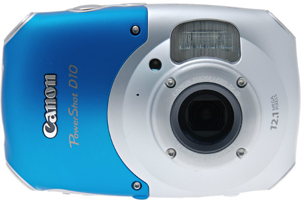 La parte frontale della macchina mette in mostra l'obiettivo e il flash, disassati rispetto al centro di simmetria. Si nota subito l'assenza del mirino ottico, fatto che costringe ad utilizzare esclusivamente il monitor posteriore per la composizione della scena.