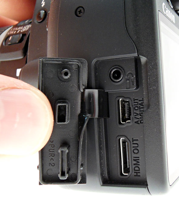 Il lato sinistro è occupato dalle prese jack dello scatto remoto, USB e HDMI. Le coperture gommate degli inserti proteggono dallo sporco ma non sono garantite contro spruzzi d'acqua ed infiltrazioni dovute alla pioggia. Anche il vano batteria e scheda di memoria non offrono protezione in questo senso. Sempre sul lato sinistro a livello della baionetta troviamo in alto il pulsante che permette di sollevare il piccolo flash integrato e in basso il tasto che attiva la pre-visualizzazione della profondità di campo.