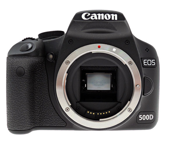 Canon Eos 500D si presenta in livrea nera costituita da plastica antiurto, attorno all'impugnatura inserti gommati rendono più agevole e sicura la presa. Le dimensioni sono contenute e si attestano a 129x98x62mm con un peso di appena 480g solo corpo senza batteria. Poco è cambiato a livello estetico rispetto alla Eos 450D anche se alcuni miglioramenti di ergonomia si fanno sentire.