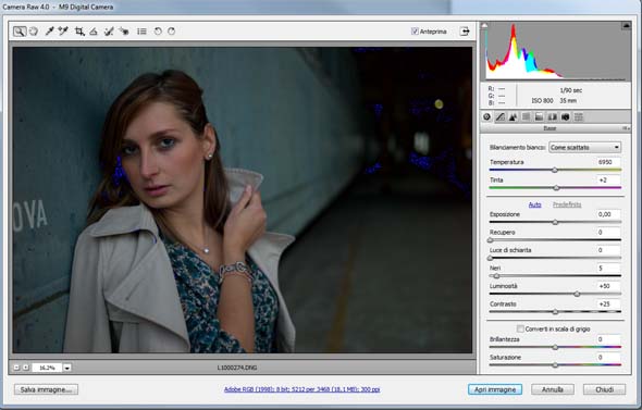 Lo scatto di cui sopra è il risultato della lavorazione Raw del file prodotto da Leica M9, inizialmente pensavamo di adottare solo il formato jpeg per la sessione di ritratto che ha visto protagonista Margherita ma, la resa dello sviluppo in macchina non permette di sfruttare appieno l'elevato recupero sia delle ombre che delle alte luci altrimenti permesso da una elaborazione raw tramite Adobe Camera Raw.
