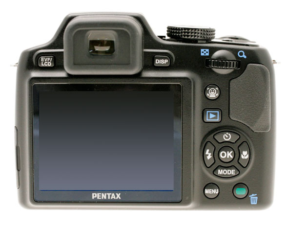 Il dorso della fotocamera è occupato a sinistra dal display lcd da 2,7", al centro sporge l'oculare del mirino elettronico mentre sul lato destro sono raccolti tutti i pulsanti di controllo. Partendo dal basso elenchiamo il pulsante di accesso al menu, subito di fianco il pulsante verde che sta trovando posto su ogni modello di fotocamere Pentax. Il pulsante verde è programmabile, può essergli assegnata una funzione specifica oppure permette in qualsiasi modalità di ripresa di portarsi in una situazione completamente automatica in modo da non perdere un momento importante.