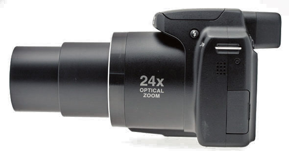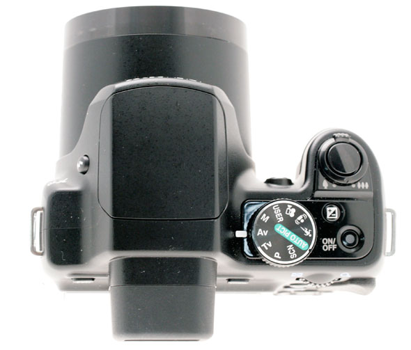 La spalla destra della fotocamera presenta la ghiera di selezione delle modalità di ripresa, il tasto di accensione spegnimento, compensazione dell'esposizione e il pulsante dell'otturatore concentrico al selettore zoom. L'estensione di quest'ultimo è notevole: a fotocamera spenta l'obiettivo è completamente ritratto nel barilotto ma appena viene accesa la fotocamera lo zoom si porta in posizione wide per estendersi a tele raddoppiando gli ingombri.