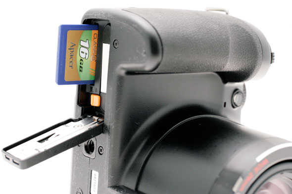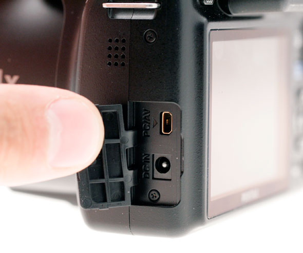 Sul lato sinistro si trova anche l'inserto coperto da una patella in gomma che ospita la presa USB/AV e di alimentazione remota. Appena sopra quest'ultima, il corpo macchina è traforato proprio dove è posizionato l'altoparlante. Il fondello della fotocamera ospita l'inserto filettato femmina per il cavalletto e lo scomparto scheda di memoria e batteria.