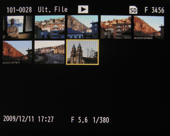 La revisione delle immagini a monitor mostra sia le foto a dimensione schermo intero che miniature delle stesse grazie alla risoluzione di 920.000 punti. Il contrasto è buono ma la coerenza cromatica non sempre è rispettata.