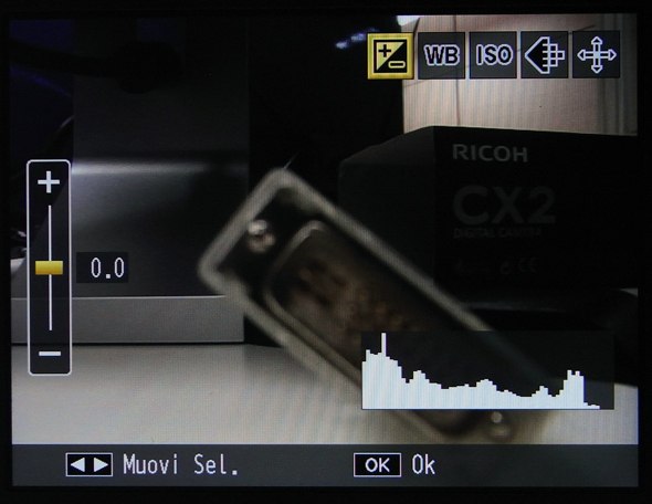 Il menu della Ricoh CX2 è molto essenziale, a seconda dei programmi di scatto impostati vengono aggiunte o tolte alcune voci specifiche dal menu che nel complesso rimane basato sullo stesso canovaccio. Due schede principali, la prima dedicata alle impostazioni di ripresa come il set autofocus, sensibilità ISO, modalità di raffica o regolazione dei parametri colore; il secondo dedicato invece alle impostazioni più generali come lingua, formattazione della scheda di memoria e impostazioni del tasto SET.