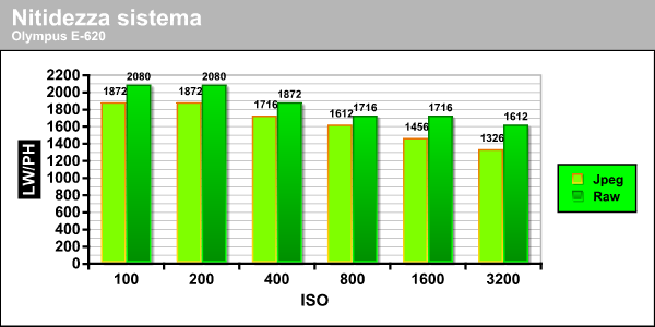 L'analisi delle mire ottiche mostra una andamento costante della nitidezza solo per i primi due valori di sensibilità: da 400 ISO in poi il calo in formato JPEG è costante. In caso di sviluppo dei file RAW con Adobe Camera RAW 5.2 siamo riusciti ad ottenere una nitidezza migliore a tutti i valori di sensibilità, ma soprattutto a contenere il calo alle sensibilità più alte.