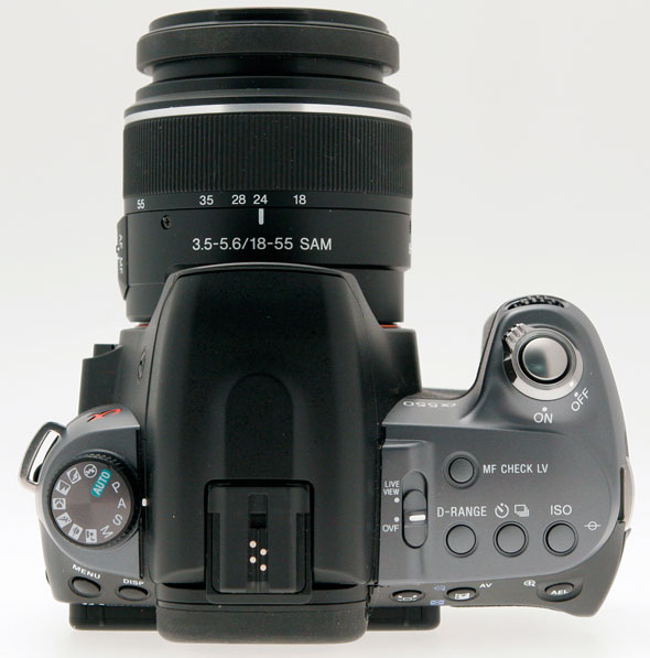 La parte superiore della fotocamera mette subito in luce una delle pecche che affligge il marchio Sony. Stiamo parlando della slitta flash di tipo proprietario, un limite che pregiudica le potenzialità della fotocamera. Di per sé avrebbe potuto essere una limitazione superabile, se Sony avesse deciso di integrare la presa Synchro. Purtroppo la Sony Alpha 550 ne è sprovvista. Al di sotto della slitta troviamo il flash integrato a scomparsa, mentre sulla spalla destra sono molti i pulsanti raccolti: qui troviamo il selettore che permette di passare dalla visualizzazione normale a live view, il pulsante di gestione dell'algoritmo D-Range, sequenza di scatto e sensibilità.