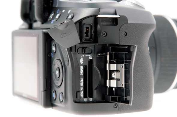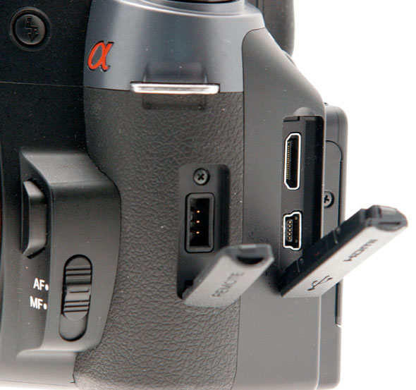 Lo sgancio del motore autofocus avviene tramite un selettore posizionato a lato della baionetta sul lato sinistro del corpo macchina. Sempre sullo stesso lato trovano posto le prese HDMI, USB e scatto remoto, protette da sportelli gommati.