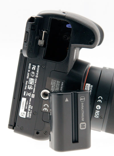 Sul lato opposto si apre il vano schede di memoria, che possiamo finalmente vedere completo sia di uno slot per schede proprietarie Sony HGDuo, sia per schede di memoria SD/SDHC. La fotocamera è incapace di gestire via firmware il passaggio da una scheda all'altra: l'operazione viene demandata al fotografo che deve aprire lo sportello schede e muovere lo switch di selezione.
