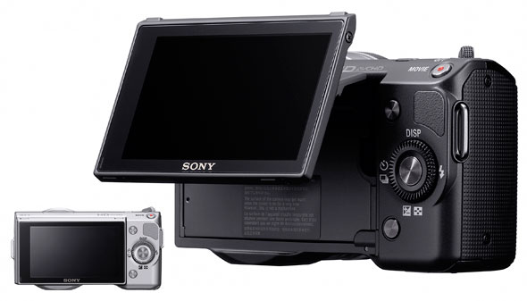 La ghiera permette di regolare in modo veloce i parametri di scatto e, cliccando nelle quattro direzioni di accedere alla regolazione di flash, punti autofocus e compensazione dell'esposizione, modi di scatto. Altri due pulsanti posti nelle vicinanze permettono la scelta delle opzioni visualizzate di volta in volta ai due corrispondenti angoli dello schermo. Quest'ultimo, come già visto in reflex e compatte di casa Sony, è orientabile in alto e in basso, ma non ha l'ulteriore grado di libertà che altre marche offrono. Il display è l'unico dispositivo di puntamento e la sua buona definizione e la buona luminosità lo rendono adatto allo scopo in quasi tutte le situazioni d'uso. Solo l'obiettivo pancake da 16mm è equipaggiabile con un mirino ottico aggiuntivo, accessorio da acquistare a parte.