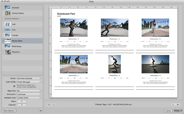 Lo strumento per la stampa permette inoltre di applicare intestazioni, watermark, filigrane o sovraimpressioni alle fotografie stampate, per evitare che, ad esempio, scatti dimostrativi vengano utilizzati da terzi. E' inoltre possibile salvare tutte le impostazioni in pratici preset, in maniera tale che sia possibile applicarle ad operazioni di stampa successive semplicemente richiamando il singolo preset.