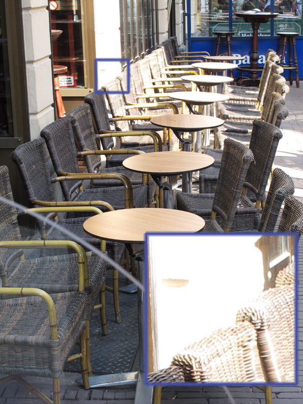 Nel recupero delle alte luci bruciate aperture ha dimostrato un passo in più rispetto alla concorrenza, anche se chiedendo di contrappasso la comparsa di colori non corrispondenti del tutto a quelli reali, introducendo ad esempio una tonalità grigia uniforme in zone caratterizzate da texture leggere, come nel caso della colonna dietro le sedie nell'esempio qui sotto.