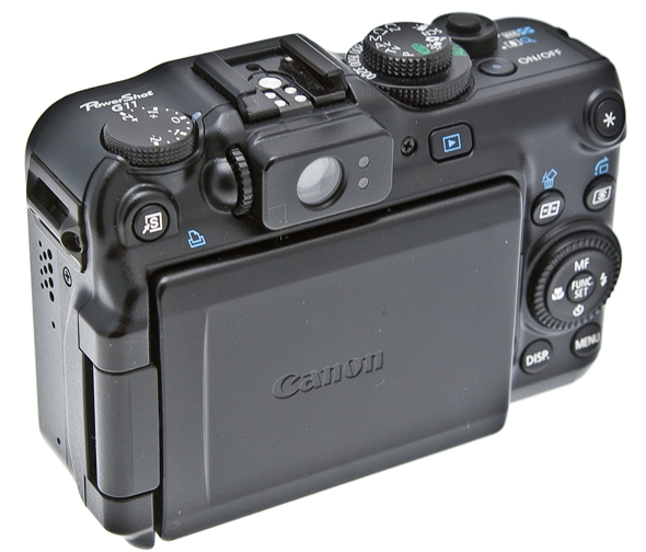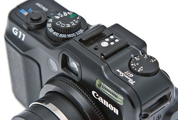 Più in alto, nell'angolo a sinistra il primo dei pulsati che si solitamente si trovano solo sulle reflex ma che la G11 invece offre: il blocco del valore di lettura dell'esposimetro, funzione molto utile per la fotografia avanzata, soprattutto in accoppiata alla modalità di lettura spot. Ai lati dell'oculare, dotato i regolazione diottrica, troviamo il tasto di avvio della riproduzione degli scatti e un tasto personalizzabile a scelta con una delle funzioni più importati. La visione dall''alto è quella che rende maggiormente ragione dell'impostazione professionale, o comunque da amatori avanzati, della Canon G11.