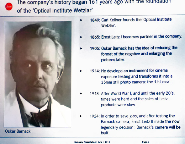 Siamo nei primi del '900 e a Wetzlar, in Germania, Oskar Barnack lavora per la Leitz, azienda divenuta ormai molto famosa per la produzione di microscopi. Appassionato di fotografia, è al lavoro su un apparecchio da utilizzare per esporre spezzoni di pellicola cinematografica per testare sul campo l'esposizione, con un otturatore con tempo fisso 1/40 di secondo. Il risultato delle esposizioni sono fotogrammi 18x24mm utili per la stampa di ingrandimenti fino al formato cartolina.