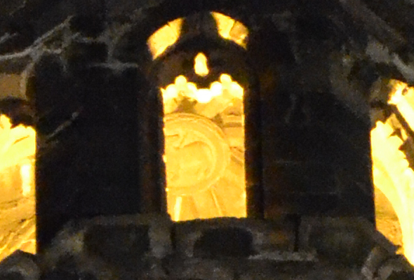 Qui sopra uno scatto a 6400 ISO che ci ha stupito per il dettaglio dei particolari illuminati all'interno della torre. I mattoni della costruzione, come spesso accade sui toni grigi alle alte sensibilità, lasciano trasparire l'insorgenza del rumore obbligando a raggiungere un compromesso tra conservazione del dettaglio e contenimento della grana e falsi cromatismi.