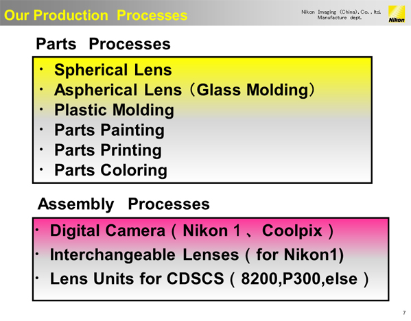 Nel 2009 il complesso ha subito un ampliamento di buone proporzioni, anche in preparazione all'arrivo delle linee di produzione dedicate al sistema mirrorless Nikon 1. Tutto il sistema Nikon 1 viene prodotto in Cina: dalle ottiche all'assemblamento dei corpi macchina. Alcune parti arrivano naturalmente da produttori partner, come ad esempio il sensore prodotto da Aptina, come hanno scoperto quelli di Chipworks, specializzati nel passare ai raggi X tutti i nuovi prodotti.