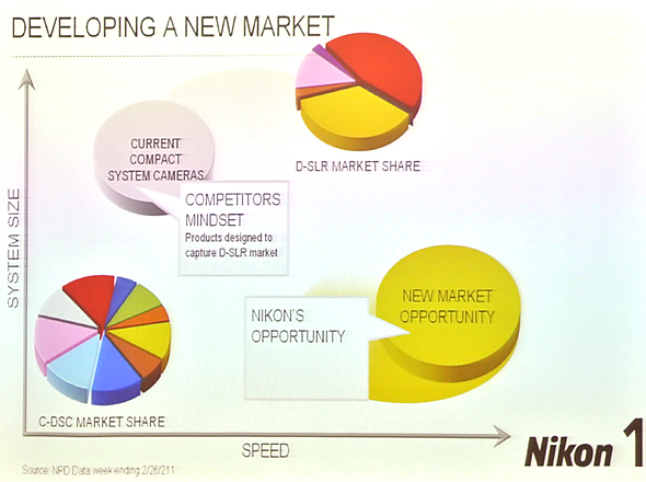 Nikon ha scelto di porre l'accento sulle dimensioni del sistema, sulla sua trasportabilità e soprattutto di introdurre la velocità come nuovo termine all'interno dei parametri di scelta dell'utenza consumer. Particolare è il target di pubblico a cui si indirizza il nuovo sistema Nikon 1: non si tratta di fanatici della fotografia, che trovano maggior appagamento nello sfoggiare un'imponente reflex, ma di utenti consumer insoddisfatti dalle fotocamere compatte, non interessati però a sistemi troppo ingombranti.