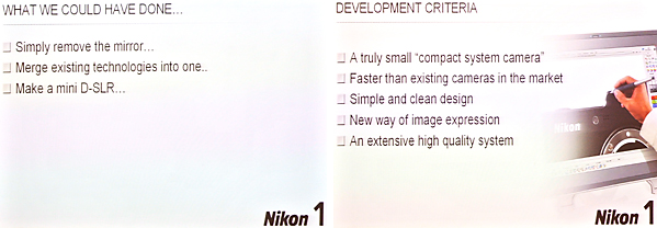 L'ingresso di Nikon del settore ha aggiunto ulteriore carne al fuoco, stimolando ancora di più la discussione in merito. La casa giallonera ha deciso di buttarsi nel settore con un progetto disegnato da zero, a partire dagli schizzi su carta, senza lasciarsi condizionare da preconcetti. L'idea da cui sono partiti i tecnici era chiara e precisa: doveva essere la più veloce del mercato, doveva essere piccola e semplice e offrire nuove possibilità di espressione. E doveva essere una Nikon.