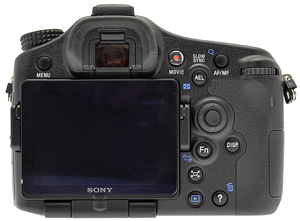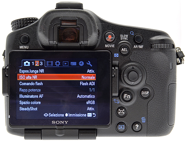 Il retro vede la presenza del solo tasto menu a sinistra dell'oculare: sotto quest'ultimo lo spazio è interamente occupato dal display, caratterizzato da un meccanismo di snodo con due gradi di libertà. Si tratta di una soluzione interessante soprattutto per l'utilizzo della reflex come videocamera. Più a destra in alto troviamo i tasti per l'avvio dei video, il blocco dell'esposizione e la commutazione tra messa a fuoco automatica e manuale. Più sotto il joystick, il tasto Fn, quello dedicato alla commutazione dei modi di visualizzazione del display, quello che avvia il crop 1.4x e 2x che moltiplicano la focale equivalente. In fondo il tasto per l'avvio della riproduzione delle immagini e il tasto guida/cancellazione.